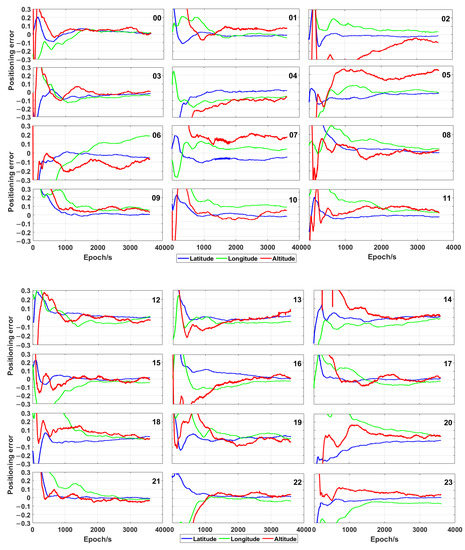In order to validate the developed algorithm, the traditional real-time PPP position data calculated by means of GAMP (GNSS Analysis software for Multi-constellation and multi-frequency Precise positioning) [41] by using GPS/Galileo/BeiDou satellites in 24 h are plotted in Figure 8. The initialisation time is inevitable for every session and is more than 10 min (the positioning errors were lower than 10 cm) for most sessions, even by using the combination of GPS, Galileo and BeiDou. Furthermore, the positioning error fluctuated a lot and was much higher than that obtained by using the proposed time-relative method. Thus, the positioning accuracy of the new algorithm is higher than that of the traditional real-time PPP technique in the time of 1 h.