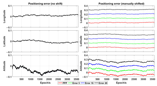 As the approximate initial position accuracy also affects the traditional time-relative positioning accuracy [19], a data set having different initial position errors (i.e., by adding errors of 5, 10 and 20 m, respectively, to each geodetic coordinate) was tested in one hour (00:00–01:00), in order to confirm whether the proposed algorithm in this work can overcome this issue.