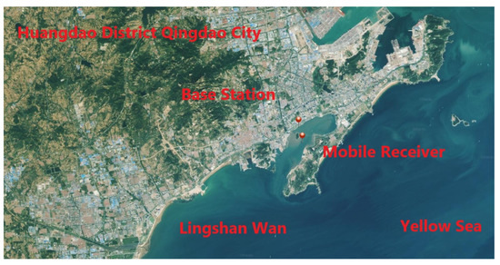 In order to confirm the positioning accuracy of the proposed positioning method, a data set collected in Qingdao, Shandong province, during a dynamic test carried out by means of a satellite receiver on an inflatable boat over one hour on 23 September 2019 was processed. A base station was placed near the mobile receiver, so that the RTK position data obtained by using GPS/Galileo/BeiDou satellites were used as reference ones. The positions of the base station and mobile receiver are shown in Figure 10. A Trimble R10 receiver was used as mobile receiver (Figure 11). Figure 12 indicates the trajectory of the mobile receiver, comprising RTK position data. The maximum distance between base station and mobile receiver is about 1300 m.