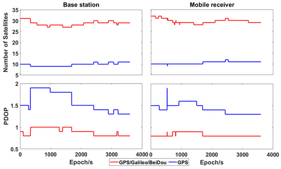 The number of visible satellites and PDOP related to both base station and mobile receiver are shown in Figure 13, which is similar to the results of static test: the combination of GPS, Galileo and BeiDou significantly increases the redundancy and improves the geometrical distribution of satellites (more uniform).