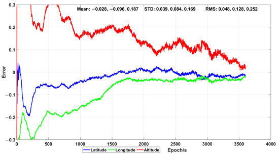 Therefore, the proposed positioning method in this work achieves a positioning accuracy of 3–5 cm. Furthermore, the positioning accuracy was uniformly distributed in the time of one hour and unaffected by the initial position error.