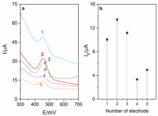 (a) Voltammograms obtained during optimization of modifier composition. Each modifier was prepared in 5 mL volumetric flask using the following amounts of carbon black (CB) and RuO2·xH2O (RuO2): (1)—10 mg CB, 1 mg RuO2, (2)—5 mg CB, 1 mg RuO2, (3)—5 mg CB, 2 mg RuO2, (4)—2.5 mg CB, 1 mg RuO2, (5)—5 mg CB, 0.5 mg RuO2. (b) Corresponding diagram.