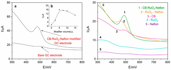(a) Comparison of differential pulse voltammetry (DPV) signal derived from 2 µM of levodopa register on RuO2-CB-Nafion glassy carbon electrode (GCE) and on bare GCE electrode in 0.025 M perchloric acid. Preconcentration potential and time were equal to 0 mV and 20 s, respectively. (b) Dependence of levodopa peak current on modifier volume. (c) Comparison of signals obtained using glassy carbon electrode modified with: 1—carbon black, RuO2 and Nafion, 2–RuO2 and Nafion, 3—carbon black, 4—RuO2, 5—Nafion. Levodopa concentration was equal to 4 µM; supporting electrolyte consisted of 0.025 M perchloric acid; preconcentration potential and time were equal to 0 mV and 20 s, respectively.