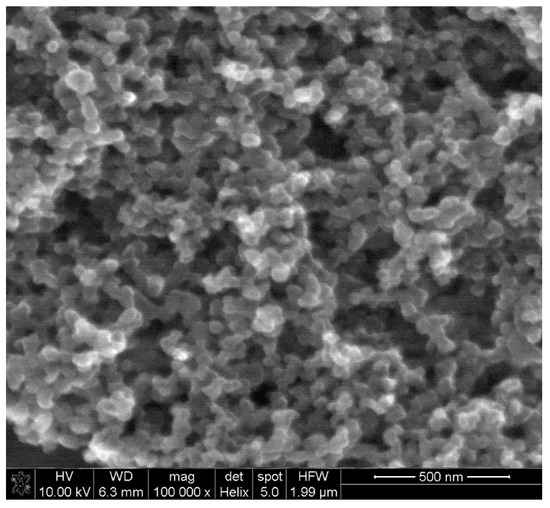 Electrochemical behavior of levodopa on the RuO2-CB-Nafion GCE and bare GC electrode was compared and is presented in Figure 2a. The test was performed using the surface modifier with optimized composition, which is described in point 2.4. In Figure 3, the characterization of morphology of RuO2-CB-Nafion GCE performed by scanning electron microscopy is presented. Carbon black might be characterized by the spherical shape with an average particle size equal to 30 nM. The second component of the electrode modifier–hydrated ruthenium dioxide has a diameter of 2 nM. An initial observation might be the difference in sensitivity between the bare and modified electrode. Peak current registered on RuO2-CB-Nafion GCE and the bare electrode was equal to 1.4 and 16.5 µA, respectively. This means that modifications enabled an increase in registered current almost by 12 times. A shift in a peak potential to lower potentials values (bare GCE 510 mV, RuO2-CB-Nafion GCE 484 mV) is also visible. This may indicate that the modified electrode has good catalytic properties. The levodopa half width peak for both electrodes are comparable. In Figure 2c, the comparison of levodopa signal measured using glassy carbon electrodes modified with each component of the final modifier (CB-RuO2-Nafion) is presented. As it can be seen, when components were used separately, a moderate effect was observed—only their combination resulted in a significant improvement of the sensor’s sensitivity.