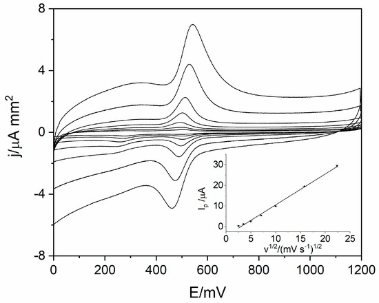 In order to identify the reaction mechanism of levodopa on RuO2-CB-Nafion GCE, linear sweep voltammetry (LSV) measurements were conducted. Voltammograms for 10 µM of levodopa were registered at different scan rates (6.3–500 mV s−1) in the potential range from 0 to 1200 mV, which is presented in Figure 4. The results showed the quasi-reversible nature of the electrode process. The oxidation peak occurs at the potential 512 mV (scan rate 100 mVs−1) and corresponds to the oxidation of levodopa to dopaquinone. The reduction peak which occurs at the potential 488 mV (scan rate 100 mVs−1) corresponds to the reverse reaction (reduction of dopaquinone to levodopa) [12,17]. The influence of scan rate on LSV voltammograms is also visible in Figure 4—the higher the value of scan rate was, the higher levodopa peak current was. The dependence of peak current versus scan rate and square root of the scan rate were plotted. Obtained diagrams revealed the linear dependence between levodopa peak current and square root of the scan rate (Equation (1)), which means that the electrode process is diffusion controlled (Figure 4 inset).