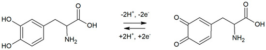In order to confirm the mechanism of the reaction, the influence of the pH of supporting electrolyte on peak potential was studied. In the experiment, six electrolytes with pH in the range from 5.7 to 8 were prepared and tested. Levodopa concentration was equal to 2 µM, and preconcentration potential and time were 0 mV and 20 s, respectively. In a studied range of pH, a linear dependence between pH and levodopa peak potential was obtained. The slope of the regression was equal to 59.7 mV pH−1, which is close to the theoretical value (59.17 mV pH−1). This indicates that 1 proton per 1 electron takes part in the levodopa electrode reaction. A probable levodopa redox reaction has been already proposed by other researchers [12,13,15,17]. Data presented in this work confirm previous results; therefore, a possible levodopa oxidation mechanism on RuO2-CB-Nafion GCE was presented in Figure 5.