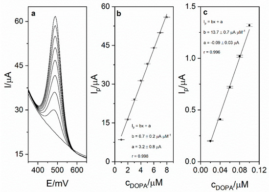 (a) DPV calibration voltammogram obtained for levodopa concentrations in the range from 1 to 8 µM and blank in 0.025 M perchloric acid. Preconcentration potential and time were equal to 0 mV and 20 s, respectively. (b) Calibration curve for the concentration range 1–8 µM. (c) Calibration curve for the range 0.02–0.1 µM.