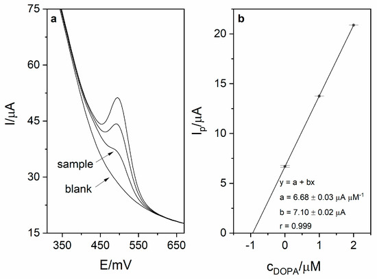 Calibration was carried out in order to investigate the analytical performance of the voltammetric method for levodopa determination. Calibration voltammograms as well as calibration curves are presented in Figure 6. The linearity was obtained for the levodopa concentration range 1–8 µM (r = 0.998; slope 6.74 ± 0.16 µA µM−1, intercept 3.16 ± 0.83 µA). Based on the obtained results (calibration presented in Figure 5), the limit of detection LOD (defined as 3 standard deviation of blank) was calculated and was equal to 17 nM (20 s preconcentration time). The limit of quantification (LOQ) was also calculated and was equal to 56 nM. Obtained sensitivity of the method was very high (6.74 µA µM−1). The comparison of the analytical performance of the developed method with other works concerning levodopa are presented in Table 2. As it might be seen, the developed method is characterized by the second best sensitivity and third best LOD value among the works presented in the table. It is also worth mentioning that the sensor used in this work is easy to prepare, which is a major advantage over other sensors described in the literature and presented in Table 2. The repeatability of the method for levodopa concentration 1 µM (n = 5) was calculated and was equal to 2.1%. In order to verify the applicability of the developed method, measurements of levodopa concentration in pharmaceuticals products were carried out (exemplary voltammogram presented in Figure 7a). For this purpose, two pharmaceutical products were chosen—Madopar 62.5 (50 mg of levodopa per tablet) and Madopar 125 (100 mg of levodopa per tablet). Measurements were performed in accordance with the procedure described in point 2.5 and the standard addition method. Results presented in Table 3 are in a good agreement with the producer’s declaration. Calculated recoveries were in the range 102–105%, which confirms sufficient accuracy of the method. The analysis of levodopa concentration in the tap water sample was also performed. The obtained results prove that the developed method might be used in the monitoring of drug pollution in tap water samples.