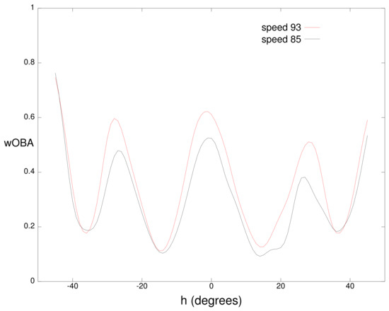 Figure 4 plots wOBA for balls hit in the air with a vertical angle of at the same two speeds. Minima in these curves correspond to the typical position of outfielders with the minima near and corresponding to the left fielder, center fielder, and right fielder respectively. For this vertical angle, balls hit in the direction of an outfielder have a higher value for a speed of 85 mph because these balls often fall in front of the outfielder for hits while balls hit at 93 mph more frequently carry to the outfielder for outs. For both the ground balls and fly balls, the largest wOBA values occur for balls hit near the foul lines () which often result in extra-base hits instead of singles.
