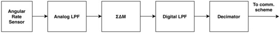 The generates a high-speed bitstream from the analog signal. The digital low-pass filter along with the decimator are shaping the frequency range of the digital signal and generates a digital signal with a lower output data rate and a higher resolution. This signal is then ready to be transferred by a communication scheme to the microcontroller or microprocessor to be processed. Thus, MEMS gyroscopes output data is characterized not only by the rate and resolution but also frequency range. Because of that, the appropriate treatment of the data must be carried out. For instance, downsampling of given data must be made correctly according to Nyquist-Shannon sampling theorem [40].