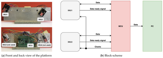 (a) Common view of gyroscope-based clock synchronization accuracy estimation system. Only two IMUs and MCU board are used. (b) Block scheme of the system. Signals transfer direction denoted by arrows directions.
