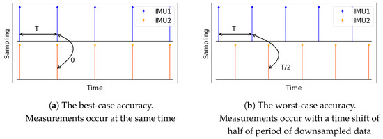 We examine two extreme cases of the time shift between different gyroscope instants: perfect alignment of data frames and the maximum time distance between them. These two cases are depicted in Figure 5. Perfect alignment has the best CSAP because the measurements made at the same instances of time differ only because of the noise and imperfections of other sensors. In contrast, the half-of-period shift has the worst CSAP because of the distinction of measurements also affected by the dynamics of movements that may change a lot during this horizon. We also assume that CSAP of any other case of alignment lies in between these extreme cases.