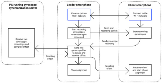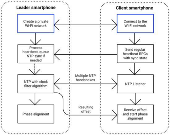 The application requires a user to start a Wi-Fi hotspot network on one device, acting as a leader smartphone and controlling other devices running the application in its network. Then, the leader and the clients perform an NTP handshake by exchanging synchronization messages. The leader smartphone runs the clock filter algorithm to select from multiple NTP samples and returns computed offset from its local clock to the client. In general, the main disadvantage of network-based protocols and, particularly, NTP is that they strongly depend on the network latency and symmetry; that is why their best accuracy can be achieved only in a local low-load network in isolated conditions.