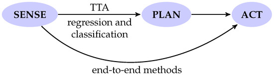 Conversely, end-to-end methods directly map raw environment perception and/or vehicle state (i.e., raw exteroceptive and proprioceptive sensory data) to navigation control actions, thus fusing perception and control of the navigation framework into a single block. From this perspective, end-to-end methods may also be seen as a particular case of TTA-based methods, as they include both TTA and control. Although end-to-end methods might appear to offer a simpler and immediate solution, they also have some drawbacks as will be discussed in Section 6. Recalling again the sequential sense-plan-act pipeline, Figure 1 depicts where TTA and end-to-end methods are placed. Finally, for both of them we distinguish between classical learning and deep learning-based solutions. In Figure 2 a scheme representing the adopted categorization method is reported. In the following sections we will make extensive use of acronyms, especially in summary tables. To help the reader, we reported a list of them in the Abbreviations section, at the end of this manuscript.