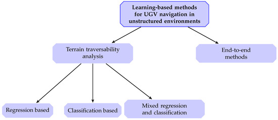 Several surveys and reviews can be found in the literature related to the navigation of ground robots, both in structured and unstructured environments, or related to general machine learning methods for robotics. The works by Chhaniyara et al. and Papadakis [13,14] provide an early overview on so-called terrain traversability analysis (TTA) methods for UGV navigation over rough terrains. Terrain traversability analysis can be roughly referred to as the problem of estimating the difficulty of driving through a terrain for a ground vehicle. This approach is clearly conceptually different from a classical obstacle avoidance problem, since most of the time no physical obstacle is actually present, whereas a trade-off between different paths has to be performed. Chhaniyara et al. focus their review on rovers for planetary exploration and soil mechanical property characterization. On the other hand, Papadakis provides a general overview on TTA ranging from classical geometry-based approaches, passing through proprioceptive-based methods and appearance-based methods and concluding with hybrid approaches. Although early learning-based methods are presented, the paper was written before the recent breakthrough of deep learning, especially in computer vision, which has also brought the sudden proliferation of alternative methods to classical machine learning approaches.