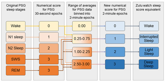 Recoding the polysomnography (PSG) sleep stages from 30-s epochs into 2-min Zulu watch sleep score equivalents. REM, rapid eye movement; SWS, slow-wave sleep.
