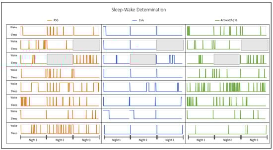 Comparison of the participants’ epoch-by-epoch sleep-wake hypnograms by polysomnography (PSG), Zulu watch, and actigraphy. A three-panel comparison of the PSG, Zulu watch, and Actiwatch 2 sleep-wake determination across all study nights by participant. Epochs are shown in study days and graphed along the x-axis. Sleep versus wake determination is plotted in orange (
