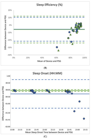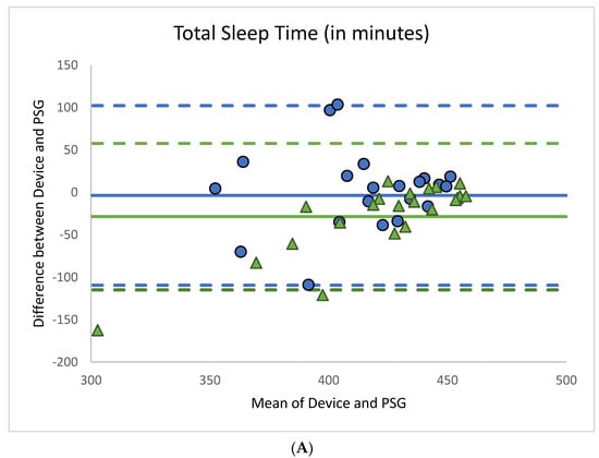 The ICCs of the summary statistics across all three systems of measurement (PSG, Actiwatch 2, and Zulu watch) are summarized in Table 4. Based on the guidelines set forth by Koo and Li [], ICCs for time of sleep onset and time of final awakening were good (0.75–0.90), indicating agreement between all three systems of measurement (PSG, Actiwatch 2, and Zulu watch). The ICCs were moderate for TST and SE (0.50–0.75) and poor for TIB (<0.50). Figure 4 summarizes the Bland–Altman plots of the mean difference between TST, SE, time of sleep onset, and time of final awakening, as measured by the Zulu watch or Actiwatch 2 compared against PSG.