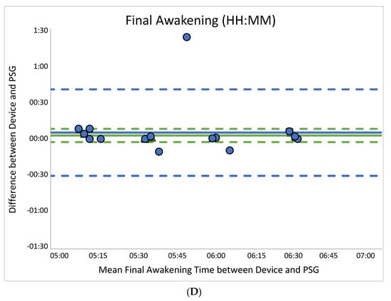 ) for the Actiwatch 2. Narrower LOAs indicate relatively less variability versus PSG than wider LOAs. Agreement is shown between measures for (A) total sleep time, (B) sleep efficiency, (C) time of sleep onset, and (D) time of final awakening. Time in bed (TIB) could not be visualized by the Bland–Altman plots because TIB was invariably set at 480 min for all participants across all nights for PSG and the Actiwatch 2.