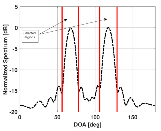 Angular regions selected from the Bartlett spectra for a uniform linear array of 15 elements in the presence of four signals incident at 65°, 70°, 115°, and 120°.