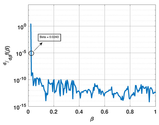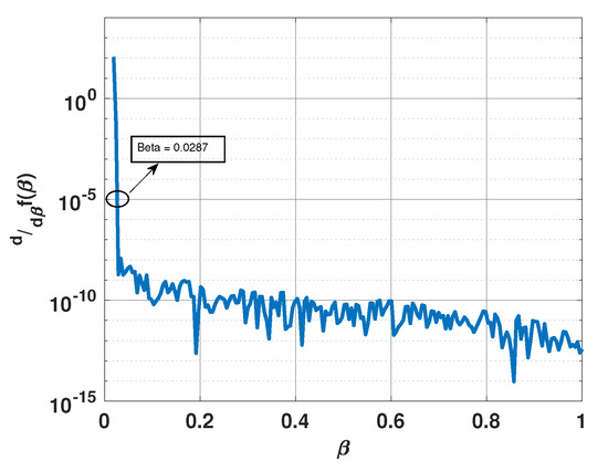 At the inflection point, the derivative of with respect to will be very small (close to zero). We propose to use the smallest value of at which the derivative of is less than or equal to , i.e.,
