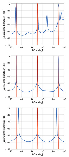 Solution vector versus DOA for a uniform linear array of 15 elements in the presence of three signals at 55°, 75°, and 95°. For this scenario, . (top), (selected beta) (middle), (bottom).