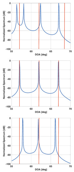Solution vector versus DOA for a uniform linear array of 15 elements in the presence of three signals at 57°, 62°, and 67°. For this scenario, . (top), (selected beta) (middle), (bottom).