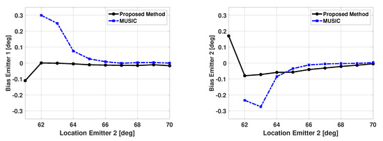Biases in the estimated direction of the two emitters versus angular separation: Proposed Method and the MUSIC Algorithm, SNR = 5 dB, 100 snapshots, 500 trials.