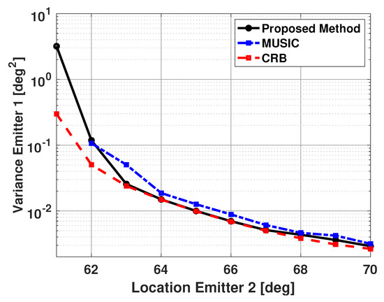 We performed Monte Carlo simulations to evaluate the performance of the proposed method for high resolution DOA estimates. For each signal scenario, 500 independent trials were carried out. Results of these trials were used to calculate the bias and variance in the estimated DOA. The variance data was compared with the Cramer–Rao Bound (CRB) [40]. We used a uniform linear antenna array of fifteen isotropic antenna elements in the simulations. The antenna elements were placed along the x-axis and had an interelement spacing of half a wavelength. All the signals were incident in the same plane that also contained the antenna array and were assumed to be of the same strength (equal SNR). The angle of arrival was measured with respect to x-axis. Thus, 90° represents broadside to the antenna array.