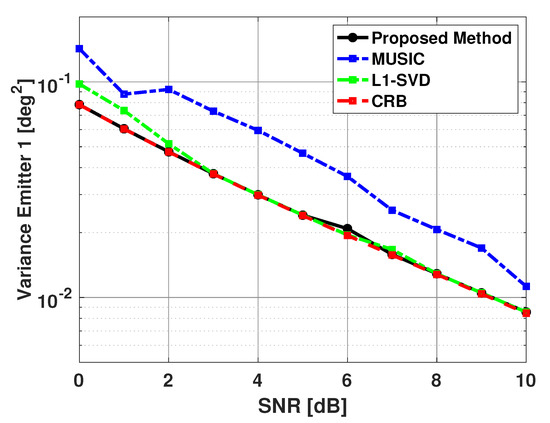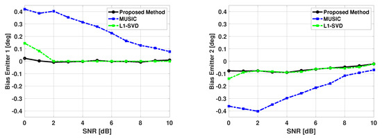 For the simulation results shown in Figure 12 and Figure 13, we chose to compare our proposed method with another sparse representation based DOA estimation technique, as well with the MUSIC algorithm. The L1-SVD algorithm is the conventional DOA estimation approach when applying sparse representation in the data domain [33]. The L1-SVD algorithm focuses on recovering a sparse signal vector using received array data and an over-complete basis of potential matches to the contributions of each signal. This recovery is based on the assumption that the signal subspace is sparse. As the algorithm name implies, sparse representation is applied in an L1-norm sense to the singular value decomposition (SVD) of the received array data to recover the sparse signal vector. This SVD can be thought of as very similar to the eigen-decomposition of the covariance matrix of the received array data. For a complete discussion of the L1-SVD algorithm, please refer to [33]. The L1-SVD algorithm has its own sparse representation regularization parameter selection method. The L1-SVD regularization parameter selection method relies on the assumption that knowledge of the noise characteristics is readily available. While this is not always feasible, the method will be used to generate the L1-SVD DOA estimates for these results. To be consistent with the proposed method, L1-SVD algorithm is simulated with the same grid of potential emitter locations for these results. From Figure 12 and Figure 13, one can see that the proposed method has better performance than the MUSIC algorithm for all SNR values shown, and a little better performance than the L1-SVD algorithm when SNR is low.