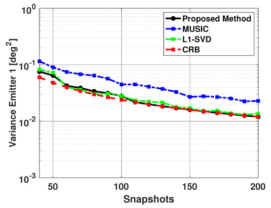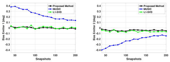 Table 5 shows the number of failures versus the number of snapshots used in DOA estimation. Note that when using a low number of snapshots, the MUSIC algorithm is not able to resolve the directions of the two signals. In addition to this, the L1-SVD algorithm also has a few failures when a small number of snapshots are used in DOA estimation. The proposed method is able to resolve the directions of the two signals for all values of the number of snapshots used in DOA estimation. Thus, the proposed method outperforms the MUSIC algorithm and L1-SVD algorithm, especially when a small number of snapshots is used in DOA estimation.