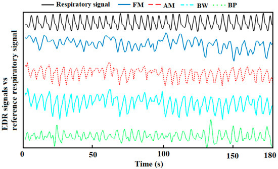 - BP algorithm: A band-pass filter (0.1–0.5 Hz) was used to capture the EDR signals. Although the normal RR for a healthy adult ranges between 0.2–0.35 Hz at rest, in our processing, we appropriately expanded the range to enable it to respond to special situations, such as the subjects’ occasional deep or rapid breaths. Besides, a wider band can help to further analyse the frequency components when there are no dominant peaks.