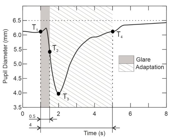 In Figure 2, there is the accommodation response of ocular motor system. The curve completely characterizes the behavior of the attacker in our application, and his/her response to glare. It is obvious from Figure 2 that the reaction time of eyesight depends on the ocular motor system, the trigeminal and oculomotor nerves, and also the response of the visual association cortex of the brain []. The pupil accommodation is described by curve and T1–T4 points, where T1 is the beginning of glare when the eye tries to adapt the diameter of the pupil and thereby reduce the perceived intensity. At the T2-point, the exposure is terminated, however the human eye, by the influence of inertia, continues in reduction of the pupil until T3, wherein the pupil begins the extension to the diameter corresponding to surrounding illumination until T4 point.