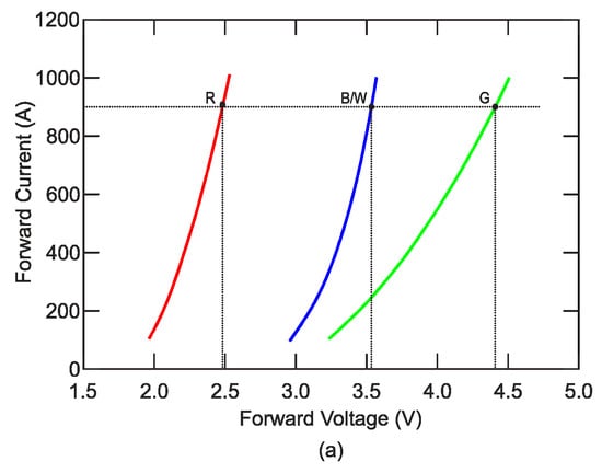 (a) RGB current-voltage characteristics; (b) typical relative spectral power vs. wavelength (adapted from []).