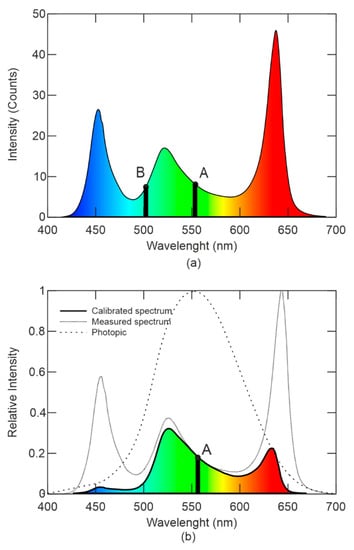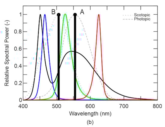 In Figure 1, there are marked points of maximum sensitivity of human eyesight by photopic vision (at point A) and by scotopic vision (at point B). The wavelength (λ) of point A is 555 nm and point B is 507 nm. From the luminance efficiency, human eyesight is the most sensitive to green color in scotopic vision as well as in photopic vision. There are also the middle wavelengths of basic colors (Red, Green, and Blue) in the graph of Figure 1.