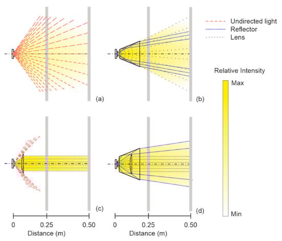 Operation radius of an LED (a) without a reflector; (b) with a reflector; (c) with a lens; (d) with TIR.
