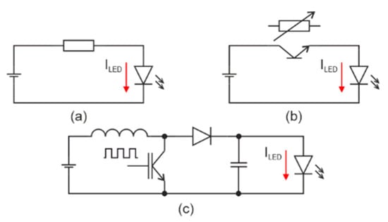 Basic principle of luminous flux drive (a) with resistor; (b) with transistor; and (c) DC/DC convertor (adapted from [,]).