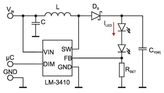 There is the schematic diagram of LED driver for one channel in Figure 9. The following calculations belong to individual components [,].