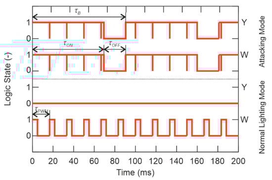 The basic principle of the designed device is the current control of every LED chip independently with a microcontroller. As for theimplementation, the RGBW LED light source is selected. Considering the design limits, two channels are implemented, the Y-channel (Red-Green) and W-channel (Blue-White). Every channel has its own exciter, driven by a microcontroller with feedback from the sensor-illumination unit. The microcontroller evaluates the press of the switch and accordingly sets the mode between normal lighting and attacking mode. In the normal lighting mode, only the W-channel is active, which is formed with white and blue LED chips and the final light emitted has a bit bluish color. In the attacking mode, both the Y and W-channels are switched affording full power. For the increase of glare effect, considering the accommodation of human eyesight; the frequency of flashes is 11 Hz in attack mode as shown in Figure 5, where the maximum effect to subjective feeling of perceiving the brightness is slightly under the flashing frequency of 10 Hz. The use of 11 Hz of flashing frequency takes into account the safety of the device and it is closely connected to hygienic standards as can be seen in paragraph 5.3. and Table 1.