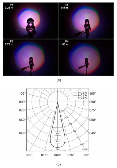 Verification of light intensity depending on the distance: (a) total light pattern; (b) luminous intensity distribution curve of ASLODE.