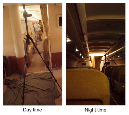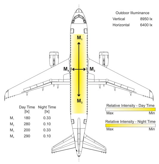 The SISU measurements took place in the front, middle, and rear of the aircraft fuselage, always in the axis of the aircraft fuselage with the sensor oriented into the front, rear, left, and right part according to Figure 15. The lighting level in the interior of the aircraft reaches 170–860 lx in the height of 170 cm above deck on the direction of the lux meter and with intensity of outdoor lighting. The level of interior lighting in dimmed windows is significantly affected by outdoor light, which depends on both the time of year and time of day, as well as factors like clouds.
