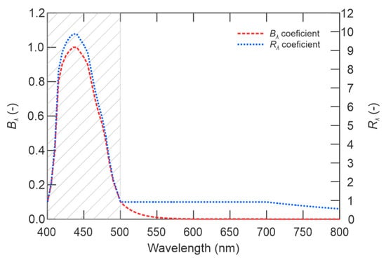 The value of the spectral radiance Lλ is determined at the space of the eye of the exposed person. The values of the Bλ and Rλ coefficients are shown in the graph of the dependence of the coefficients on wavelength in Figure 17.