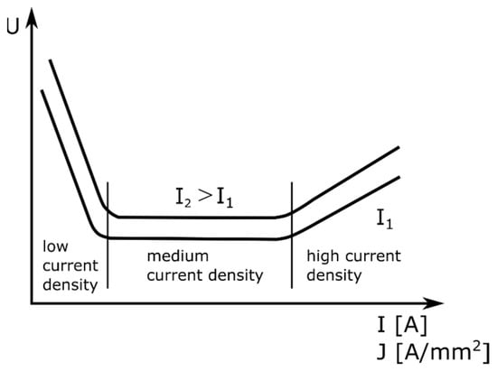 An electric arc is an electric discharge in an atmosphere of highly ionized gases and metal vapors. The necessary condition for the arc to glow is ionization of the gas filling the space between the electrodes, i.e., there must be electric charges (positive ions, negative ions, and electrons). An electric arc can arise as a result of a flashover between the electrodes that are spaced a short distance apart or the contact of the electrodes followed by their separation. In the first case, ionizers generating high-frequency pulses with a voltage of several thousand volts (e.g., tungsten inert gas (TIG) welding) are needed to cause the flow of electrons. In the second, commonly used case, a voltage of several dozen volts is enough (e.g., welding with coated electrodes or a submerged arc). The electric arc widens conically towards the surface to be welded, regardless of the polarity of the welding current. Three zones are distinguished in the ionized space between the electrodes: the cathodic voltage drop space (UC), the arc pole (UAR), and the anodic voltage drop space (UA). By measuring the current J and the voltage U while the arc is glowing, it is possible to determine the static characteristics of the arc (Figure 2). The static characteristic of the arc shows the relationship between the voltage and the current of the arc: U = UC + UA + UAR = f (j).