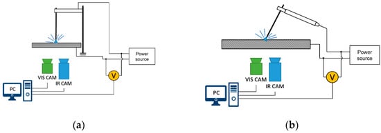 In [,,], a technique of modelling the welder response to welding pool surface was presented. The welding current as a response to the 3D weld pool surface, as characterized by its width, length, and convexity, was studied, and human welder behavior modelled. A method of welding skill evaluation using high-speed welding current and arc voltage in MMA was also elaborated [,]. In this method, the probability density distributions was calculated based on recorded electrical signals and the differentiation between experienced and novice welders was made. Other sensing and reasoning techniques are also proposed to limit or reduce the appearance of defects like the arc voltage sensor [,,], acoustic emission measurements [], thermography [,], vision light cameras [] and sound [,]. Additionally, there are many multisensory techniques that are often supported by artificial intelligence, showing in some cases of welding monitoring an impressive performance regarding accuracy and robustness. As an example, the multisensor information fusion technology was applied to predict the penetration status in pulsed TIG [,,,]. In [], the depth and width estimation of the weld bead in TIG based on multisensor information fusion and an artificial neural network was proposed. Most studies presented results obtained on mechanized and robotized stands for welding methods that are carried out in an automated manner, such as gas metal arc (GMA) and TIG welding. This is the case for arc length–arc voltage relationship investigation [,,,] and for the monitoring of the welding process using vision systems [,,].