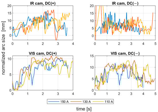 Image sequences obtained on the test stand for arc length measuring (Figure 4a) were subjected to a processing procedure described in Section 2. In Figure 7, there are plots of the normalized arc size, being the squared root of the minor and major axis length product. Those axes were calculated for the ellipse, having the same second moment as the welding arc ROI. Signals from VIS CAM were smoothed using the moving average method, while to assess changes in the IR CAM, an envelope signal was calculated. It can be easily seen that for the positive polarity, despite the welding current, all signals have an increasing characteristic, especially in the first part of the process, when the burning of the electrode was stable. It can be stated that the welding arc length is quite well-represented in the considered welding arc ROI feature, when dealing with VIS CAM images. In the case of the IR sequence, there are more disturbances in the signal. Nevertheless, the growing trend is also clear for the DC(+) polarity. For the negative polarity, especially in the IR CAM signal, there is a noticeable lack of process stability. There is no expected growth in the major axis length of the considered arc ROI. Taking into consideration weld current, for the stable DC(+) realizations, for the lowest current value, the process lasts for the longest time, but there are noticeable disturbances in the part, when the welding arc was long, and the air gap between electrode tip and the welded sample was still increasing. The process that was realized with the current set to 130A was the most stable.