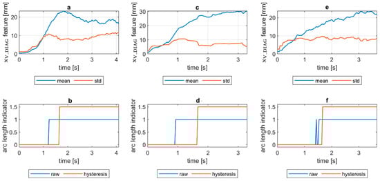 Comparing means and standard deviations of the diagnostic signal in the longer time window (Figure 14, Figure 15, Figure 16, Figure 17, Figure 18 and Figure 19a), the mean feature value is always strongly connected with the arc length. It can be seen in Figure 16a that the increase in arc length around the 13th second is significant. In this moment, the welder had lifted the rod tip and as a result the arc length was so long that it neatly caused the arc’s extinction. Moreover, problems with arc ignition are also visible at the welding procedure’s beginning, where the mean feature value is 0 (same the standard deviation). A similar situation can be found when analyzing the DC(−) polarity (Figure 19a). The standard deviation signal values were also elevated when welding with a long arc. It is generally lower for the negative polarity, which is caused by the smoothing in feature calculation, because high impulses, provoked by arc instability, are in this case removed. Applying the welding arc length indicator () with the limits mentioned in Section 3.2., a decisive signal can be extracted. When dealing with raw values, in each procedure a smaller or larger number of regions suspected of exceeding the optimal arc length can be found.