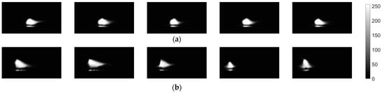 Five consecutive frames representing welding arc luminance taken by the VIS CAM: (a) short arc DC(+) cladding; (b) short arc DC(−) cladding.