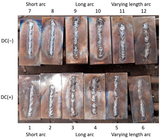 View of test clads made during the experiment with the constant welding current 140 A. In the top row, cladding was performed using DC(−) polarity, while for the samples in the bottom row, DC(+) polarity was applied. The welder performing the experiment made welds using three arc lengths: samples 1,2,7,8—a short, stable arc was used, and arc length was about 3.5 mm; samples 3,4,9,10—too long an arc was applied, and arc length was longer than 6mm; samples 5,6,11,12—the welder changed the arc length during the process, it has changed from short, stable arc, to long, unstable one.