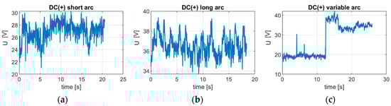 Voltage change caused by arc length variations for the DC(+) polarity: (a) stable—short arc (s2); (b) unstable—long arc (s3); (c) varying length arc (s5).