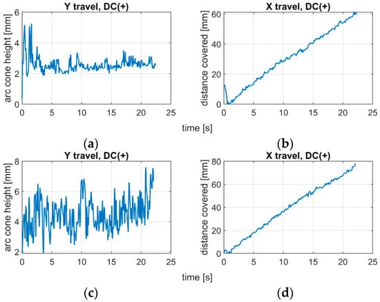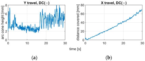 The applied polarity substantially influences the arc length and dynamics of arc change. Analyzing the position of centroids of arc ROI in the IR camera sequences, it was found that the negative polarity is characterized with fast changes in arc length, and due to highly unstable process realization, there is a difficulty in keeping the welding speed constant (Figure 12). For the positive polarity, when the arc is too long, the dynamics of arc geometry changes are also high, but the travel speed is easier to maintain on the same level during the whole process (Figure 13). The constant welding speed would be represented in the X travel path as a straight line. Adding a trend line to all X travel scenarios, the R2 for the positive polarity was around R2 = 0.98, while for negative polarity R2 < 0.93.